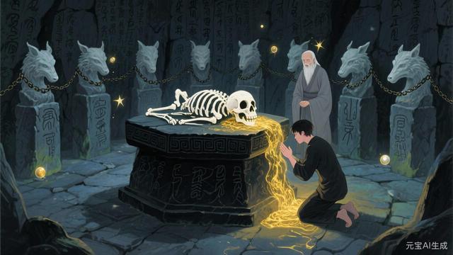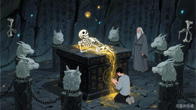 石室中央,矗立着一座丈高的石坛,石坛由黑色的岩石砌成,表面刻满了密密麻麻的符文,坛顶摆放着一具洁白的枯骨,枯骨盘膝而坐,双手结印,头颅微微低垂,仿佛在沉睡。枯骨周围,摆放着八尊狰狞的兽首雕像,兽首口中衔着黑色的锁链,锁链的另一端连接着枯骨的四肢,将其牢牢地束缚在石坛上。
