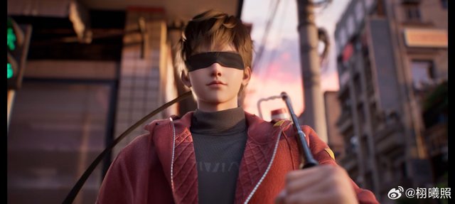 只见在马路的对角,一个穿着黑色短袖的少年正站在那,双眼上缠着厚厚几圈黑色布缎,严严实实的挡住了所有光线。