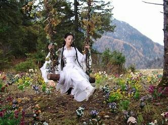 红衣仙女大姐哇,这里好美啊,我要在这里荡秋千