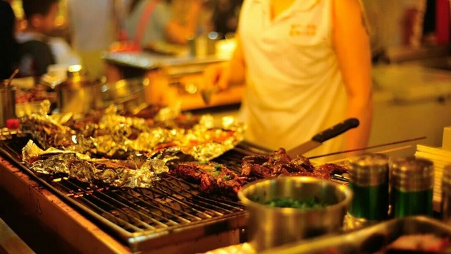 老板热情地招待客人,拿起刷子刷独家秘制酱料,又翻过去烤,烤完之后再刷一层。