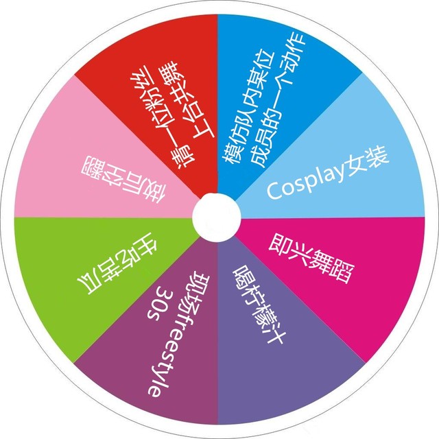 内容有......即兴舞蹈、喝柠檬汁、现场freestyle 30s、生吃苦瓜、做后空翻、请一位粉丝上台共舞、模仿队内某位成员的一个动作、Cosplay女装。