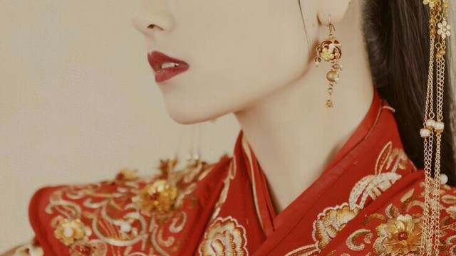 矫中人,一身火红的嫁衣,处处都是喜庆的氛围,发髻被微微挽起称得眉目淡雅肤若凝脂,她低垂着眸色里的浅浅哀愁,连带着耳垂上精致的黄金坠子轻轻摇晃,
