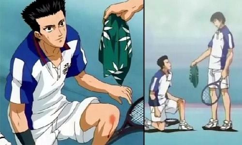 于是两人同调,同样的姿势跳起了芭蕾舞,在桃城和海棠大惊之时,球已经打了过去,落在地上。