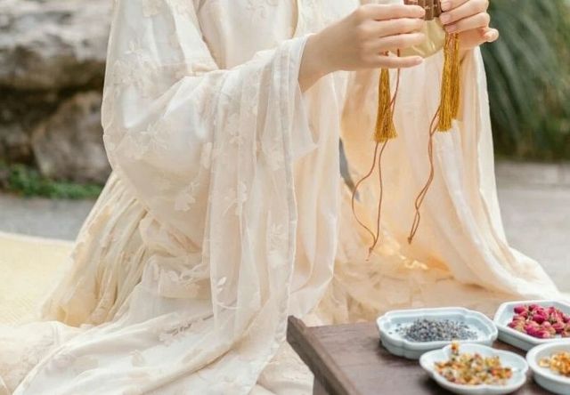 金阳殿中,薰香环绕,木桌上摆着各种不同的香料,一女子精挑细选地将几种香料塞入一个鹅黄色的香包里。