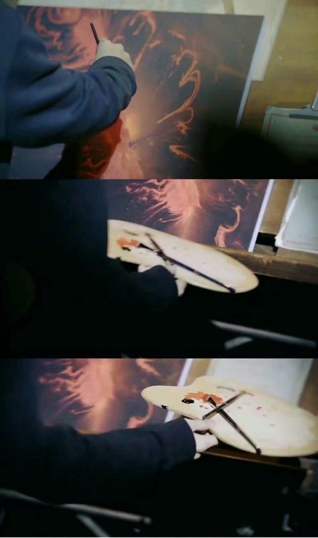 扑鼻而来的是浓郁的檀香味道,周围墙壁上挂满了艺术作品,地上摆满了画架,每一个画架上都有不同未完成的作品
