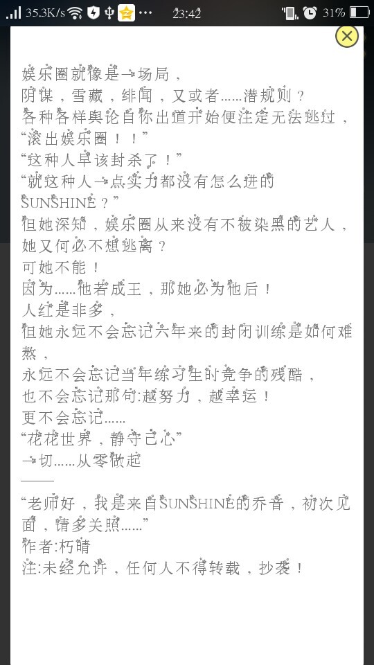 朽晴这里朽晴,一个文笔很渣但是很努力的作者。