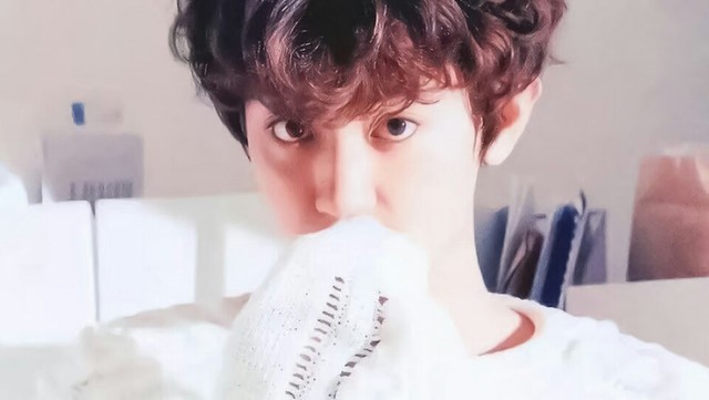 我轻轻的舔了一下嘴唇的奶油,吴世勋温柔的趴在桌子上看着我。