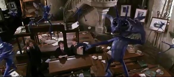 这好像打开了潘多拉的盒子。小精灵像火箭一样地四散奔逃。其中两个拉着纳威的耳朵,把他提在半空中。还有几个撞出了窗户,后排的人被碎玻璃撒了一身。其余的继续有效地破坏着教室,这比一头横冲直撞的犀牛的破坏力还强。他们拿起墨水瓶,四处地泼洒。撕碎课本,试卷,把墙上的画也撕个精光。把垃圾箩整个倒放,抓起书包和课本就往窗外扔去;几分钟以内,半个班的学生都藏在桌子底下,纳威则被吊到天花板上的技状的灯上。