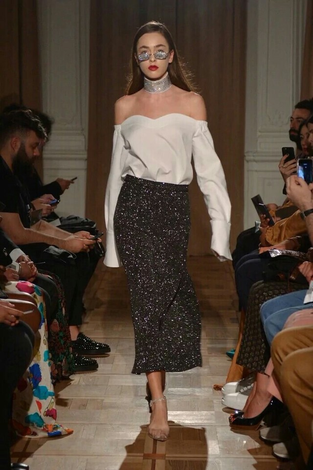 我穿着一件落肩长衣,亮片长裙,有点酷酷的感觉,在吴世勋身边坐下。