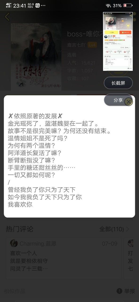 “正当君离要走进绝情湖,焚尽自己所有的情愫的时候被一个声音给打断了。”