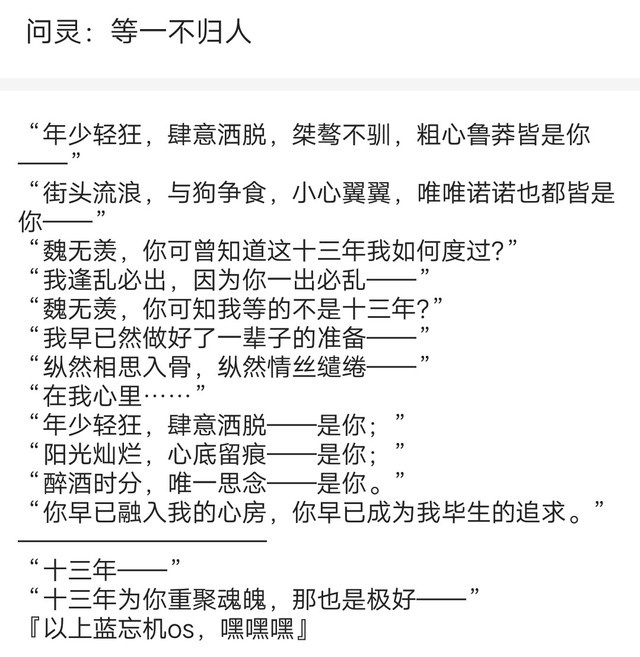 “年少轻狂,肆意洒脱,桀骜不驯,粗心鲁莽皆是你——”“街头流浪,与狗争食,小心翼翼,唯唯诺诺也都皆是你——”“魏无羡,你可曾知道这十三年我如何度过?”“我逢乱必出,因为你一出必乱——”“魏无羡,你可知我等的不是十三年?”“我早已然做好了一辈子的准备——”“纵然相思入骨,纵然情丝缱绻——”“在我心里……”“年少轻狂,肆意洒脱——是你;”“阳光灿烂,心底留痕——是你;”“醉酒时分,唯一思念——是你。”“你早已融入我的心房,你早已成为我毕生的追求。”——————————“十三年——”“十三年为你重聚魂魄,那也是极好——”『以上蓝忘机os,嘿嘿嘿』