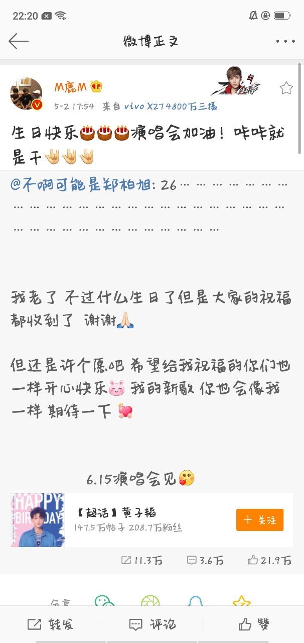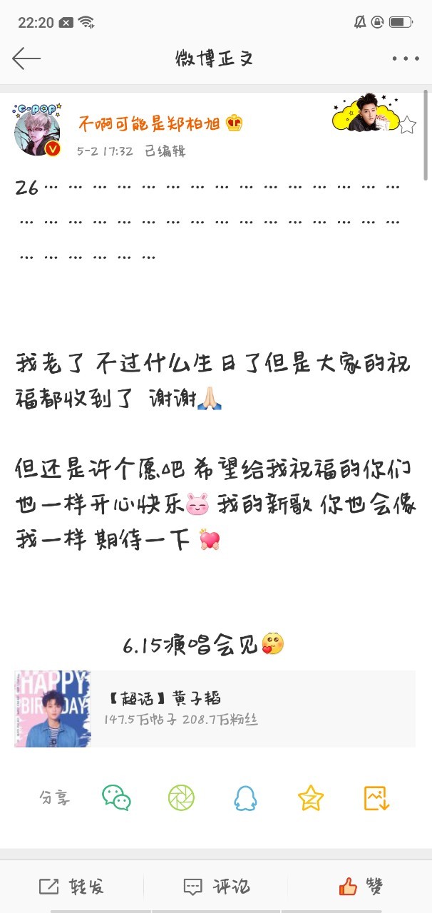 Tao啊,你不老,你永远都是我们最爱的大熊猫。希望你能够天天开心,祝演唱会成功哦!