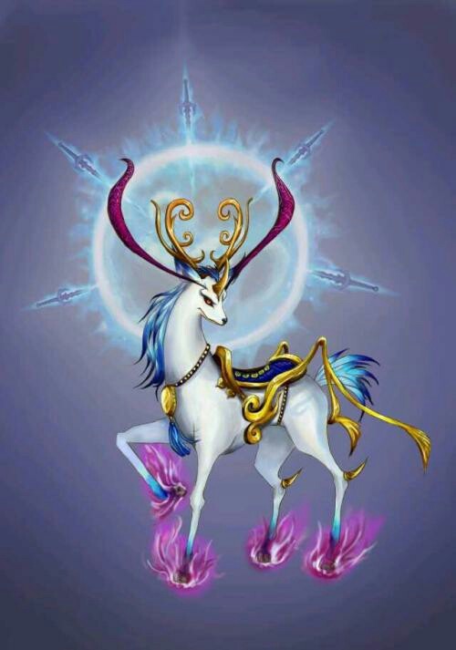 一处山顶,一只白色的鹿,黄金三角,深红角饰,黄金项链,镶金座鞍,蓝色鬃毛,蓝色短尾,脚踏紫火,尊贵无比前方几百魇兽林立
