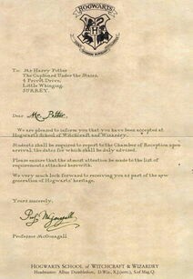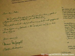 亲爱的先生(小姐):我们愉快地通知您,您已获准在霍格沃茨魔法学校就读。随信附上所需书籍及装备一览表。学期定于九月一日开始。我们将于七月三十一日前静候您的猫头鹰带来您的回信。
