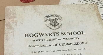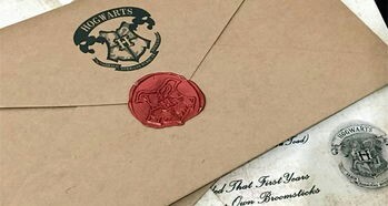 信封是用厚重的羊皮纸做的,地址是用翡翠绿的墨水写的。没有贴邮票。信封上边有一块蜡封、一个盾牌纹章,大写“H”字母的周围圈着一头狮子、一只鹰、一只獾和一条蛇。