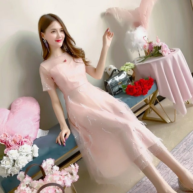 肉粉色的连衣裙衬得茗溪的皮肤很白,可爱的风格让茗溪更是增添了一分上小俏皮。