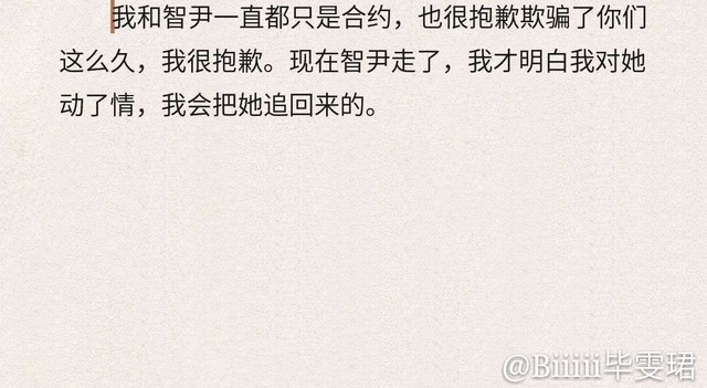 我和智尹一直都只是合约,也很抱歉欺骗了你们这么久,我很抱歉。现在智尹走了,我才明白我对她动了情,我会把她追回来的。