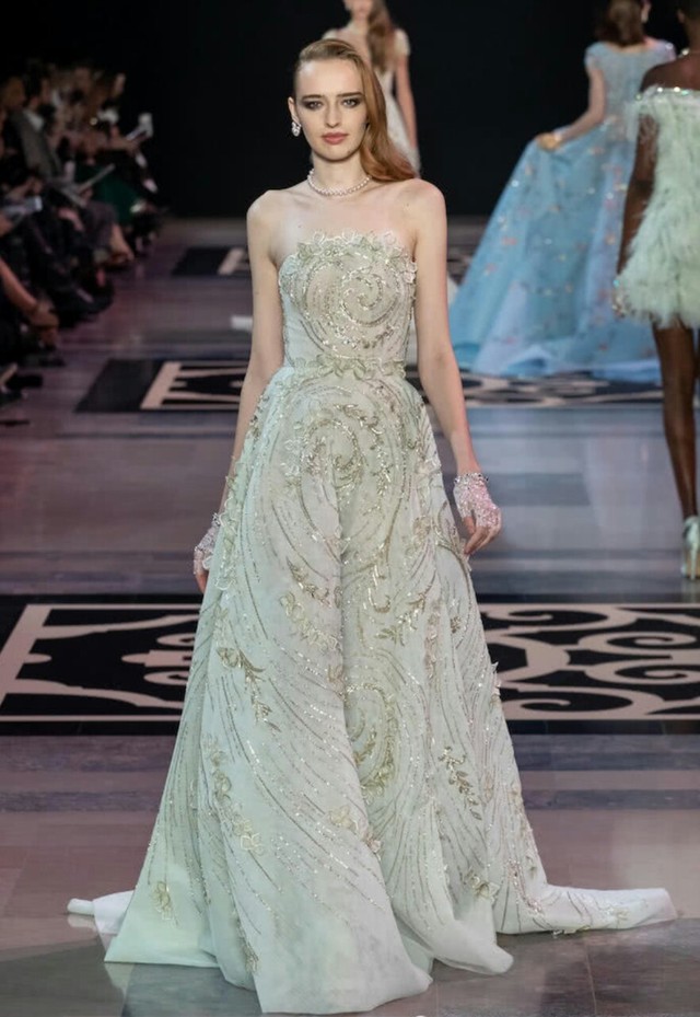 至于当天的礼服,选择了GEORGES HOBEIKA当季发布的高定长裙,整体薄荷绿色调,是李谅托圈里的朋友借来的。