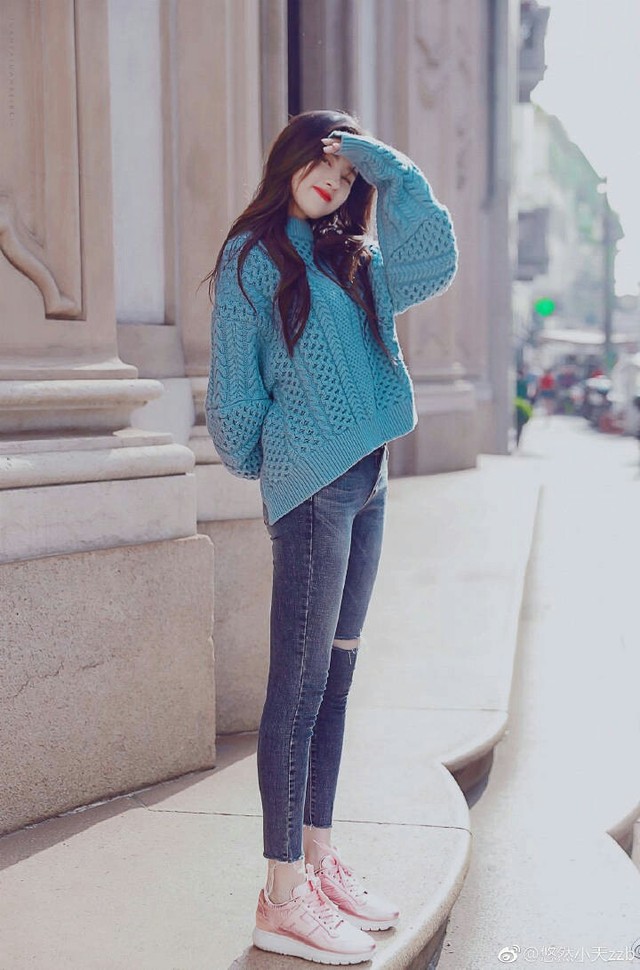 蓝色宽松毛衣下是一条蓝色牛仔裤,一双桃花鞋上面露出了乳白色的脚踝,乌黑而柔顺的长发自然的披在两肩