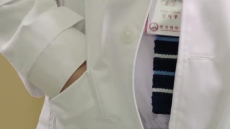 双手插进白袍的口袋里,脖子上挂着的红白相间的工作牌随着他的动作轻轻晃动,左胸前上方的口袋里别着颜色不一的圆珠笔,下方则是蓝色的细线绣着的手写字—朴灿烈。