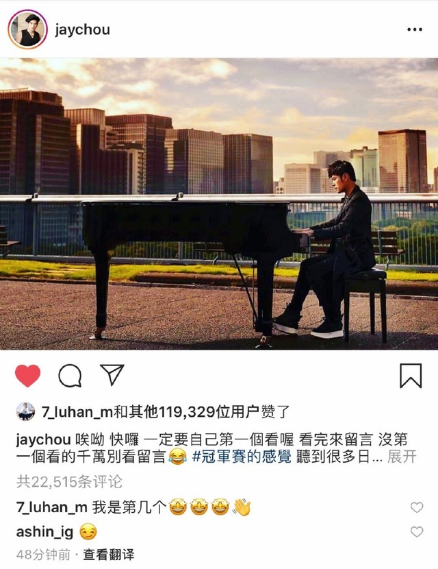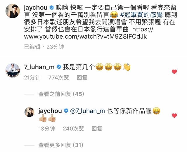 鹿晗ins评论周杰伦新歌:“我是第几个”