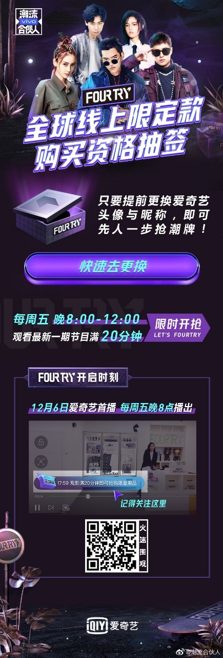 潮流合伙人潮流合伙人#听说有人想要FOURTRY限定单品?四试飞速赶来~12月6日开始,每周五晚8点至12点,登陆爱奇艺观看最新一期节目满20分钟,即可参与FOURTRY全球线上限定款潮品购买资格抽签!机会难得,扫码完善好个人信息,祝你中签快人一步哦,爱奇艺VIP会员每期节目还额外获得一次抽签机会~ 扫描下方二维码或者点击下方链接,课代表四试只能帮大家到这里了[doge]赶快行动起来吧!不说了,本试也搓手手准备起来了~潮流合伙人定档#http://t.cn/AieUULPR