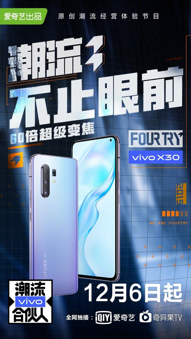 潮流合伙人欢迎@vivo入伙,正式成为FOURTRY战略合伙人!http://t.cn/AiebJPK2,锁定爱奇艺#潮流合伙人#,60倍变焦超远摄,潮流大片尽掌握,未来一起敢潮不赶潮。