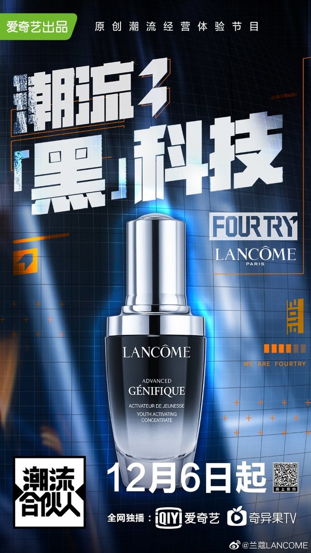 潮流合伙人欢迎@兰蔻LANCOME入伙,正式成为FOURTRY战略合伙人!http://t.cn/AiebXFwZ,锁定爱奇艺#潮流合伙人#,潮流不打烊,肤质要闪亮。和主理人吴亦凡@Mr_凡先生亲选小黑瓶,一起敢潮不赶潮!