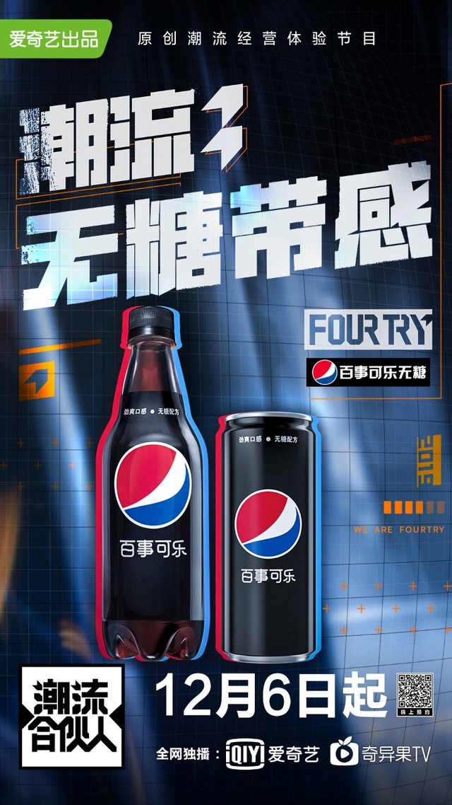 百事中国V:潮流无糖带感,劲爽FOURTRY更敢!12月6日起,每周五晚8点,爱奇艺全网独播,#百事可乐无糖#在#潮流合伙人#正式营业,#劲爽无糖有型带感#,潮,我们是认真的。你,#敢潮不赶潮#!@潮流合伙人