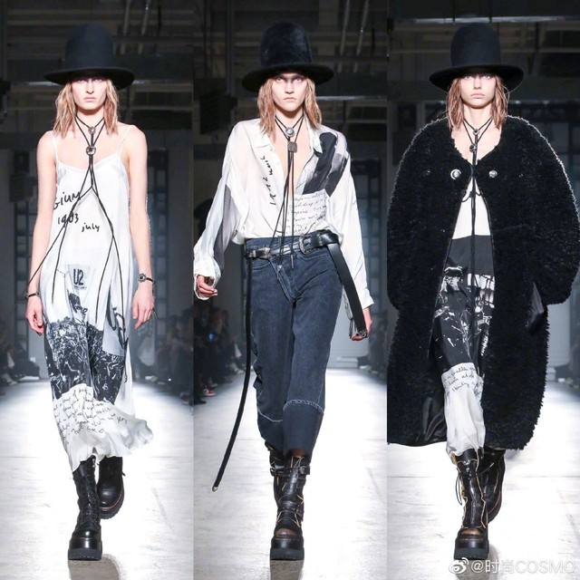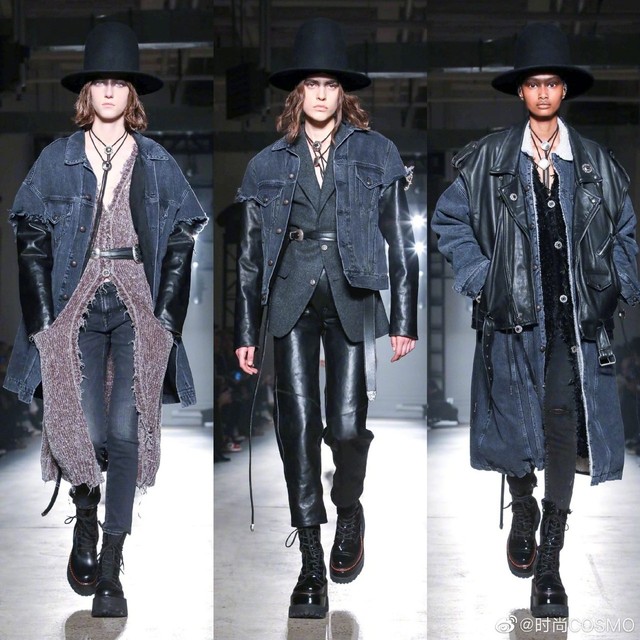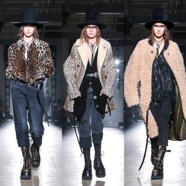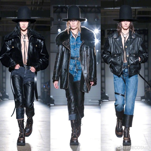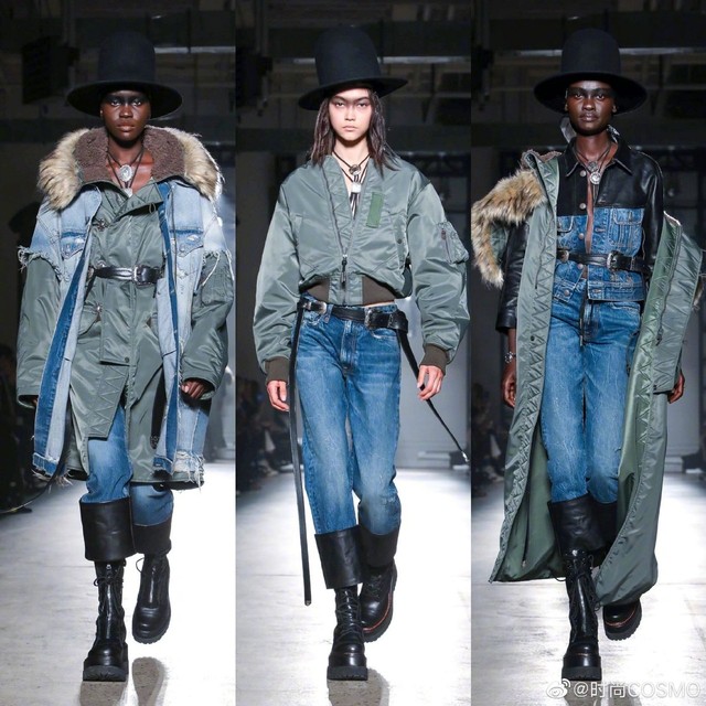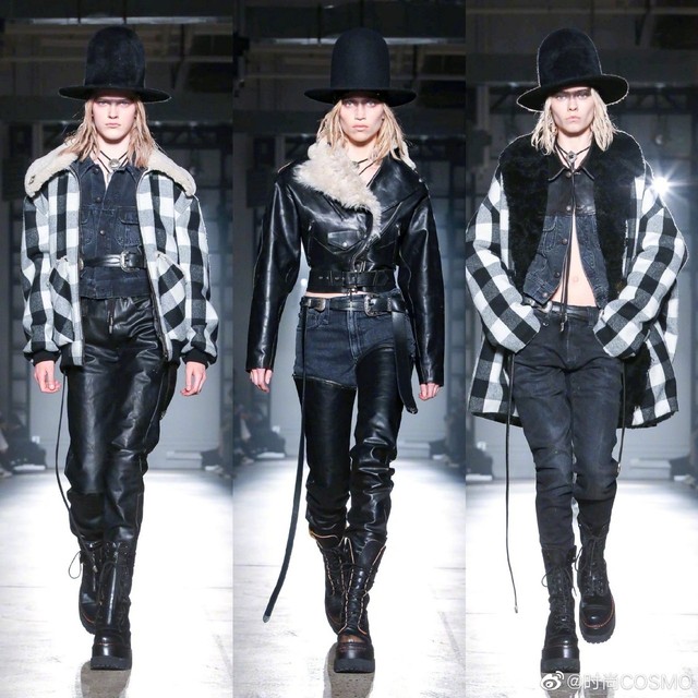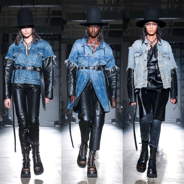 时尚COSMOV:#COSMOgirl占领时装周#R132020秋冬系列,#牛仔永不过时#💅皮革与造旧款牛仔拼接的街头雅痞范儿~再搭条腰带是精髓!豹纹、摇粒绒、迷彩等各式大衣都是牛仔裤的好拍档,长度及腰的颈部配饰个性十足[酷]当然一定不要错过脚下,很难不被R13的马丁靴种草~#纽约时装周#