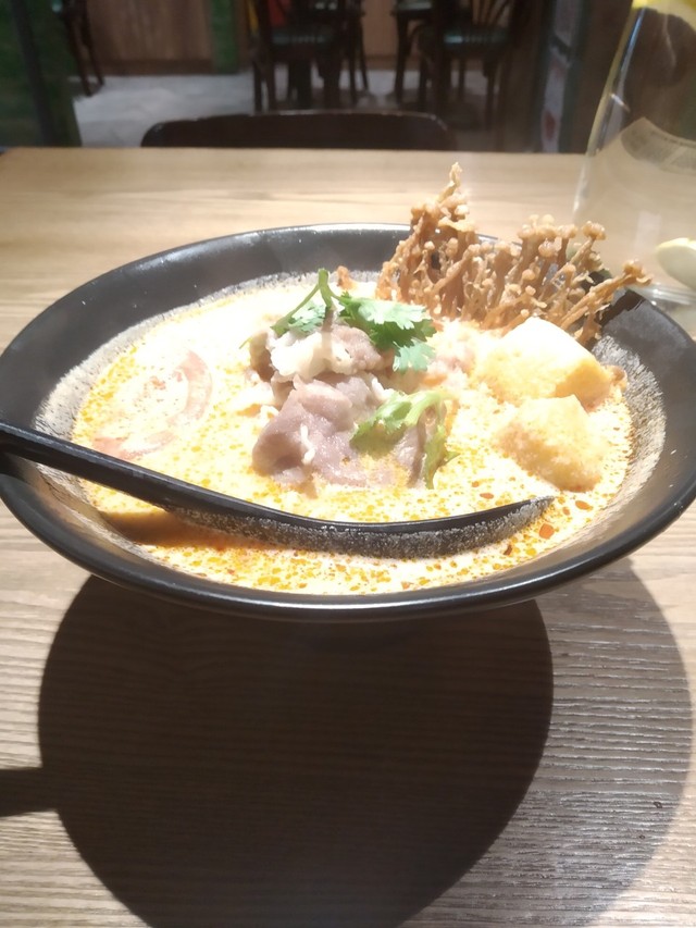 作者今天去外面吃饭,这家店的面条很不错。我点的是冬阴番茄肥肉面,是辣的。
