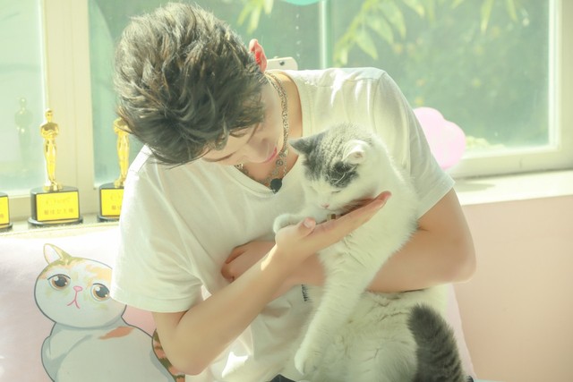 黄明昊走过去抱起猫咪,猫咪见到主人,乖乖地趴在他怀里,朝他喵喵喵地叫。
