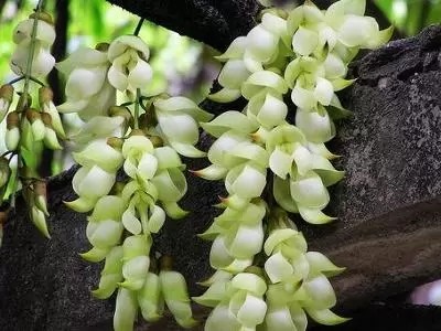 远看禾雀花,还以为真的是一群禾雀藏身在花藤中。白色的禾雀花,如果采摘下来两三小时后就会变成褐色,就更加似禾雀了。如果不小心损伤了花瓣,便有红色的汁液流出来,就像血液一般,显得更加神奇。禾雀花一般都在清明前后开花,花期40天左右。禾雀花一般都是只开花,而不结果。