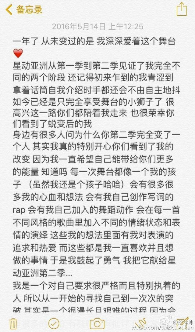 蔡徐坤我实现不了梦想或者是想退缩是我就会写一些来鼓励自己嘛。我觉得如果没有我梦想的支持和爱坤们的支持,就没有我的今天,非常感谢你们,谢谢。(哭了)