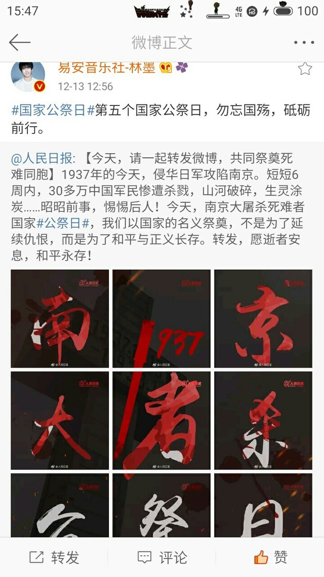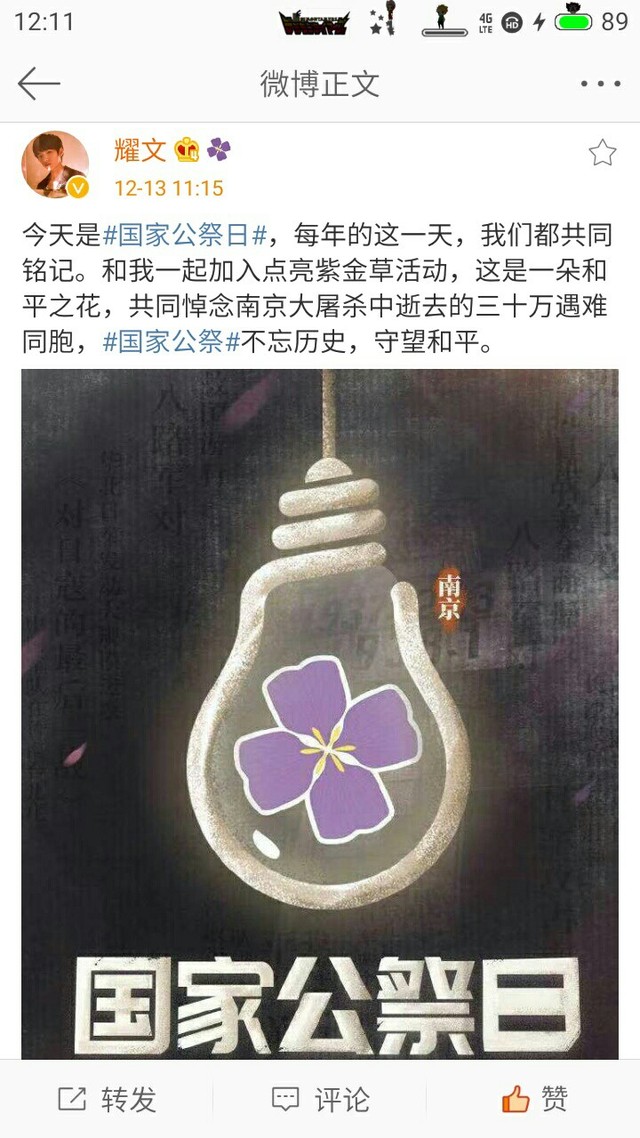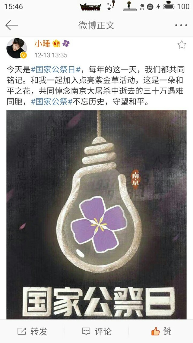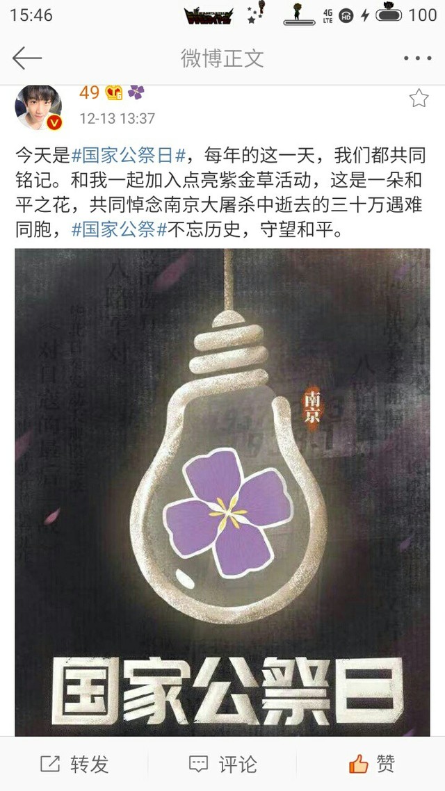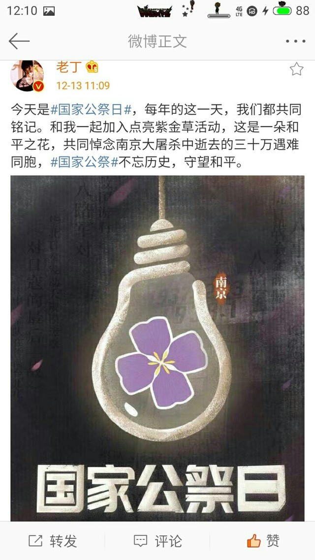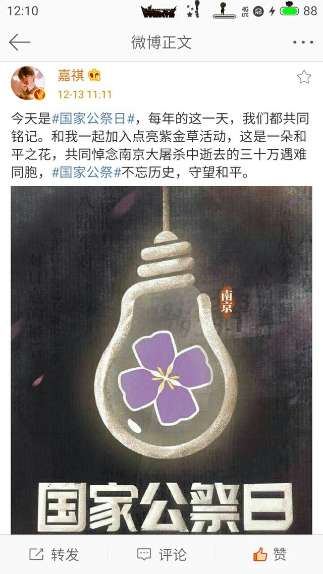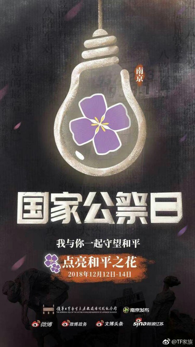 今天是#国家公祭日#,每年的这一天,我们都共同铭记。和我一起加入点亮紫金草活动,这是一朵和平之花,共同悼念南京大屠杀中逝去的三十万遇难同胞,#国家公祭#不忘历史,守望和平。