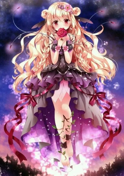 月光下,星辉斑斓,一位宛如从古老传说中走出的少女,静立于这梦幻之境。她拥有一头如黄金般闪耀的长发,巧妙地编织成两个活泼的丸子头,点缀其间的是几朵娇嫩的粉色小花,仿佛晨曦初现时草尖上的露珠。少女的眼眸如同两颗珍贵的红宝石,在夜幕中熠熠生辉,透露出不为人知的秘密与渴望。她身着一袭紫黑交错的华美礼服,那件礼服前短后长,巧妙地结合了深邃的暗纹蕾丝与轻盈飘逸的大拖尾设计。无数细碎的花瓣散布其上,在微风中轻轻摇曳,如同夜空中最温柔的星光。腕间与足踝处系着精致的粉红丝带蝴蝶结,随着她的每一个动作翩翩起舞,为这份静谧增添了几分灵动之美。少女手中紧握着一朵绽放的玫瑰,它似乎承载着某种特殊的意义,或许是爱情的象征,亦或是勇气的证明。在这片充满魔法与奇迹的土地上,她正等待着属于自己的故事缓缓展开