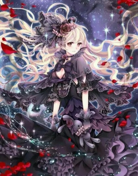 月光下,艾琳娜站在古堡的露台上,夜风轻拂过她金黄色的长发,让每一缕发丝都仿佛拥有了生命,在空中轻盈地舞动。她那双深邃的棕色眼眸里倒映着远处森林中的点点星光,仿佛整个世界都在这一刻静止了。她身着一袭黑色蕾丝长裙,精致的花纹与细腻的质地在月色下更显华贵,而那些小巧的头饰与长手套,则如同点缀在夜幕中的星辰,散发着柔和而迷人的光芒。一阵微风吹过,带着初夏的气息,空中飘下了几片玫瑰花瓣,它们轻轻地落在艾琳娜的肩头,为这宁静的夜晚增添了几分浪漫与梦幻。她微微一笑,伸手从怀中掏出一只毛茸茸的小兔子玩偶,那是她儿时最珍贵的记忆。此刻,这只小兔子不仅代表着她内心深处那份不曾改变的纯真与温柔,也是她面对未知挑战时最坚强的力量来源。在这片属于她自己的小小天地里,艾琳娜感受到了前所未有的平静与安宁。