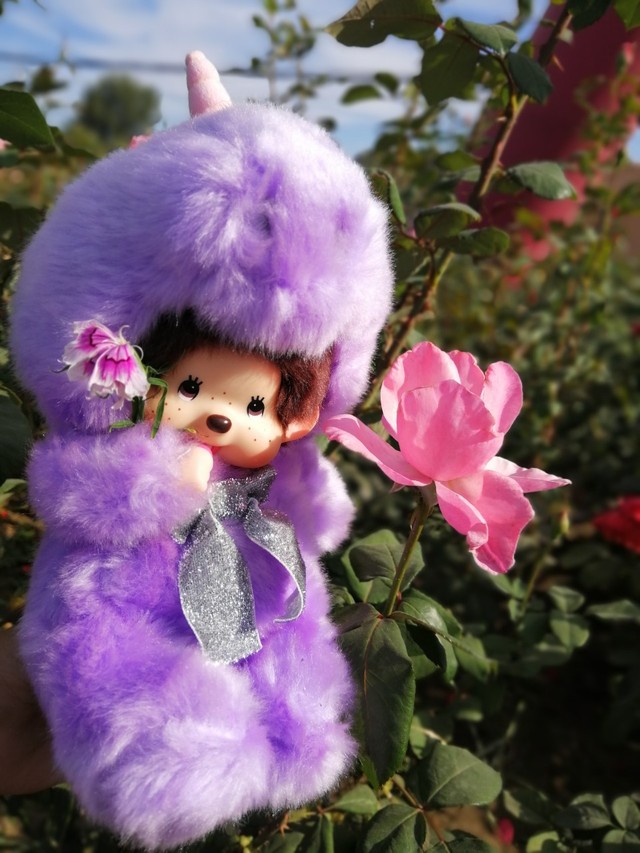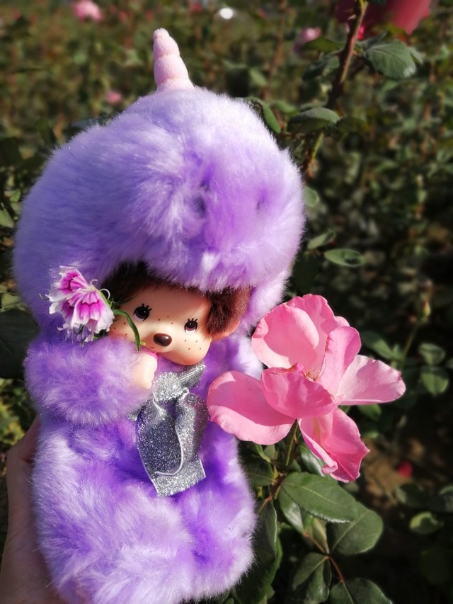 紫色的蒙奇奇小怪兽搭配娇艳欲滴的粉月季花是不是很漂亮呢?
