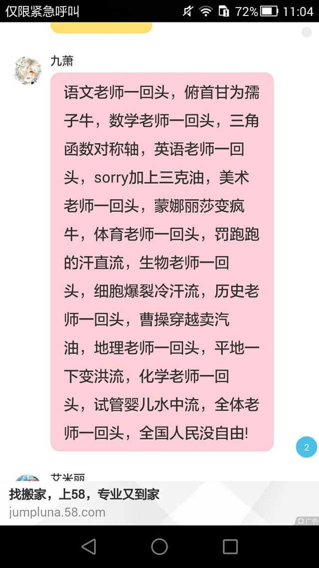 作者蓝雪语文老师一回头,俯首甘为孺子牛,数学老师一回头,三角函数对称轴,英语老师一回头,sorry加上三克油,美术老师一回头,蒙娜丽莎变疯牛,体育老师一回头,罚跑跑的汗直流,生物老师一回头,细胞爆裂冷汗流,历史老师一回头,曹操穿越卖汽油地,理老师一回头,平地一下变洪流,化学老师一回头,试管婴儿水中流,全体老师一回头,全国人民没中没自由!