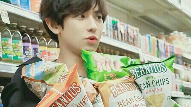 朴灿烈顶着一头乖乖少年的发型,加上满口的粗话充满了违和感,他怀里抱着一堆零食,放进推车。