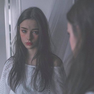 一个女孩慢慢的从白色的从柜子后面出来