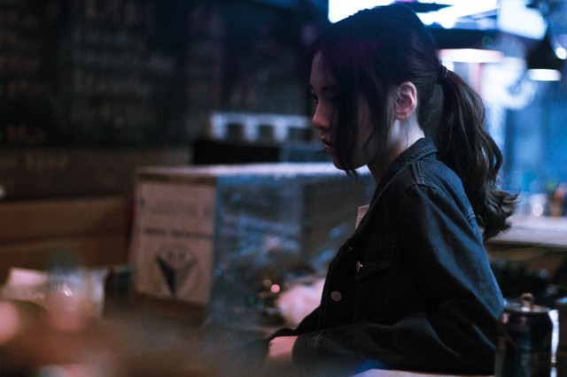 灯光闪耀,从紧闭着的窗帘后面缓缓出来一个女孩