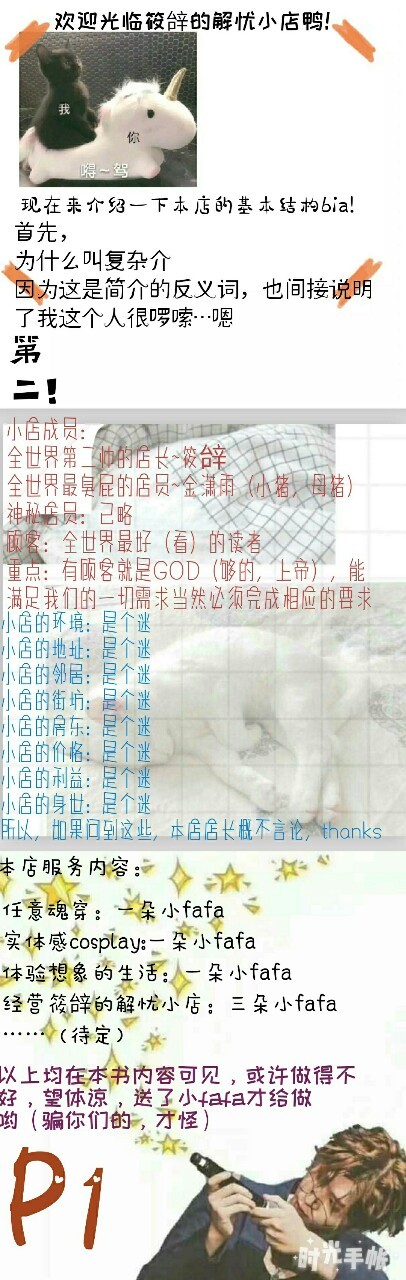 全世界第二帅的筱辝声明一下哦:每项都有期限,最大限度十天,体谅一下学生党筱辝,角色添加不要太多,越多角色越忙不过来,按投稿格式写,写清楚点,谢谢配合吖!