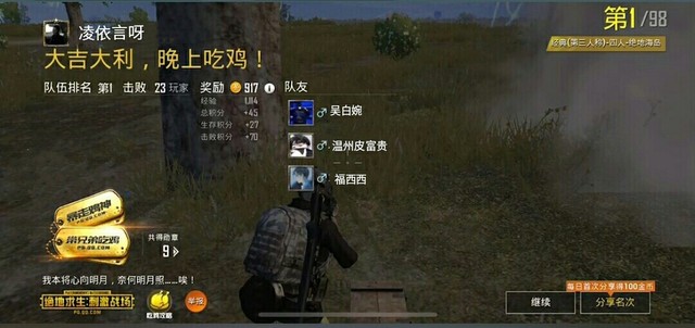 你的队友凌依言呀用Kar98k击杀了带你吃鸡带你飞
