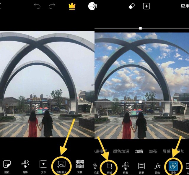 ☁️用PicsArt打开一张照片后点击下方的“添加照片”注意:添加的是你的天空素材哦