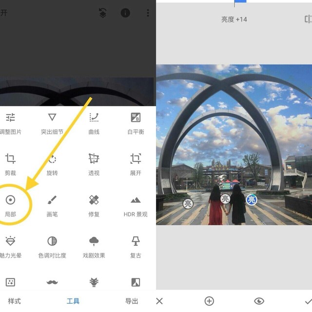 ☁️所以继续打开\"Snapseed\"的“局部”调节亮度