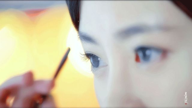 她端坐在梳妆台前,拿着眉笔描绘着细眉,