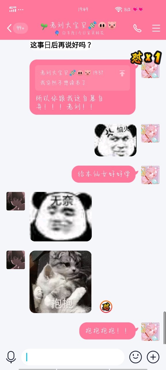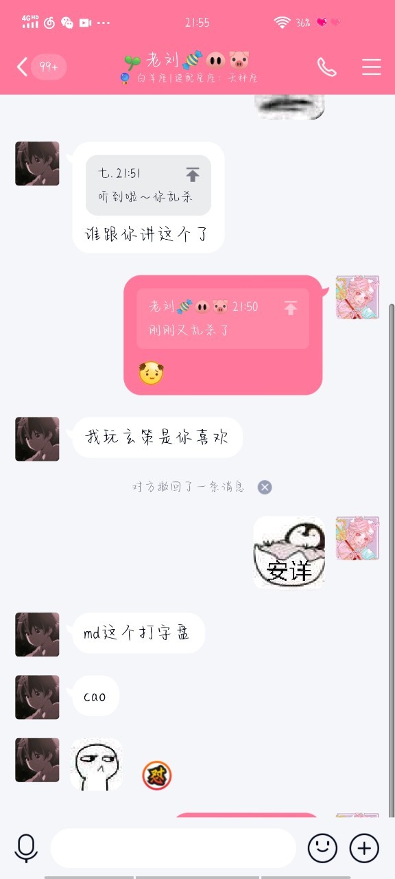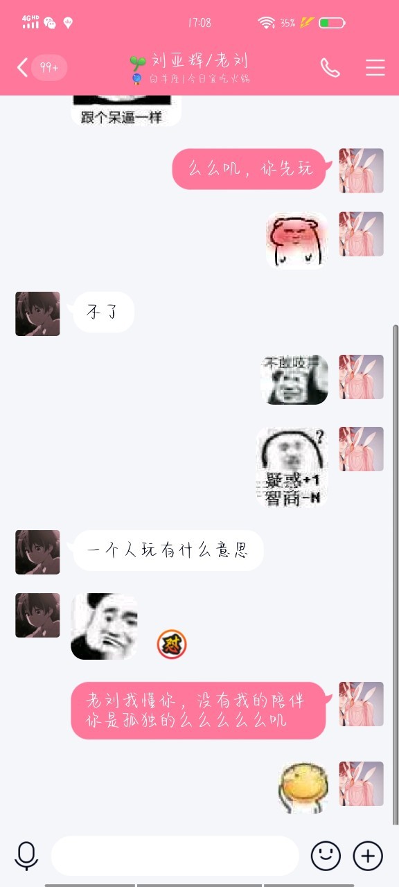 安逸一之后当时同学带我玩网,给我介绍了一个男的,我就跟他处对象,换了情头,刘亚辉看到后就问我是不是处对象了,我说“我在网上处了一个,没处过试试”他那次就回了我一个“嗯”之后每次都是我主动找他聊天,他不会来找我,我每次找他聊天他都会草草的结束了话题,跟网上的没处一个星期我就把他删了觉得真的很没有意思 (对了对了,在这之前我还给刘亚辉起过外号,“老刘”) 之后我跟老刘说了我的经历后他好像不像之前了,还是那样敷衍着聊天,我当时才真正的意识到我喜欢的是老刘,好可惜啊