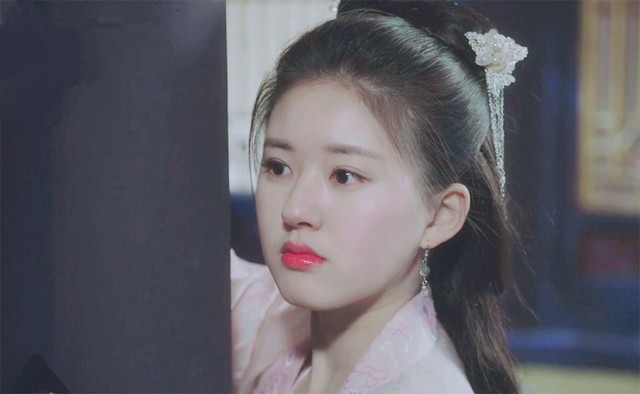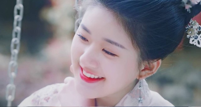 她长发挽起,一蓝色翡翠流苏发坠垂在耳边,粉色的珠环自耳洞落下,笑容甜美。