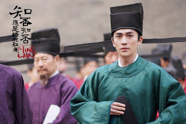 他走在前头,手上拿着朝牌,一袭蓝色官服,向台阶下走去。